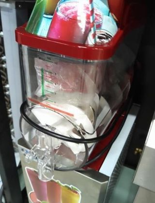 Máquina granizadora con tres depósitos para preparar bebidas frías. - Tres dispensadores. - Etiquetas de sabores: Cola, Kiwi Peché, Tropical Blu.