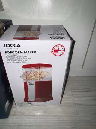 Máquina para hacer palomitas de la marca JOCCA, con un diseño retro en color rojo y blanco. - Modelo: Vintage. - Potencia: 1200W. - Tiempo de preparación: 3 minutos.