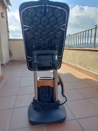 Centro de planchado vertical con diseño moderno y funcional. - Color naranja y negro. - Depósito de agua extraíble. - Asa ergonómica para el vapor.