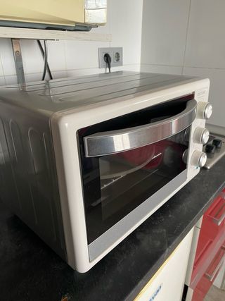 Horno eléctrico Moulinex, ideal para cocinar, calentar o gratinar sin necesidad del horno grande. Funciona perfectamente y está muy limpio tanto por dentro como por fuera. Medidas: Fondo 31 ( incluyendo tirador) Ancho 46 Alto30 ✔️ Temperatura regulable hasta 240º ✔️ Temporizador con aviso ✔️ Resistencia superior e inferior ✔️ Bandeja y rejilla incluidas ✔️ Puerta de cristal con buen cierre Estado: muy buen estado, con señales mínimas de uso (ver fotos). Interior limpio y resistencias en perfecto funcionamiento. Perfecto para apartamentos, segunda residencia, oficina o cocina pequeña.