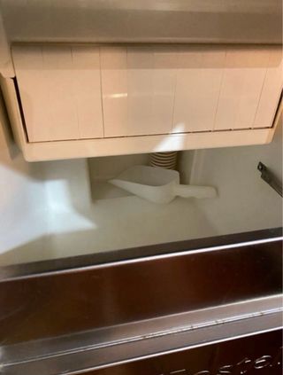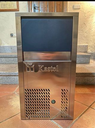 Máquina de hacer hielo de la marca Kastel. - Diseño moderno en acero inoxidable. - Panel frontal con acabado en color azul oscuro. - Rejillas de ventilación en la parte inferior. - Tubos de desagüe y toma de agua nuevos