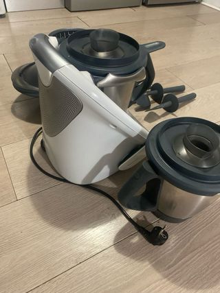 Robot de cocina Thermomix TM5 en buen estado. - Incluye vaso, tapa, cuchilla y mariposa. - Incluye cestillo y espátula. - Incluye varoma y tapa. - Incluye libro de recetas. tiene 2 vasos 2 cuchillas 2 tapas 2 cubiletes 2 mariposas 2 espátulas y bolsa de transporte