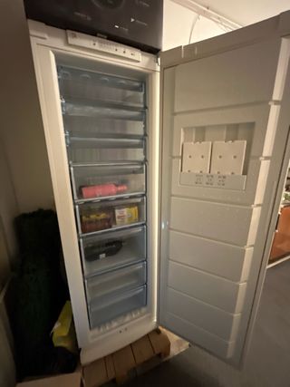 Congelador vertical de color blanco. - Diseño moderno y funcional. - acumula hielo, pero funciona - cajón central bastante grande, abajo puerta abatible - tiene uso, pero todavía cumple con su función NO envío este producto