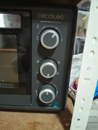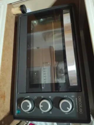 Horno eléctrico compacto de la marca Cecotec. Ideal para cocinas con espacio limitado. SE VENDE BARATO PORQUE SE HA OXIDADO UN POCO, PERO FUNCIONA PERFECTAMENTE. - Color negro. - Mandos giratorios para ajustar temperatura y tiempo. - Puerta con cristal para visualizar el interior. - tiene luz interior - temporizador con sonido