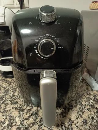 Freidora de aire en color negro. Cuenta con controles de temperatura y tiempo. - Control de temperatura ajustable hasta 200°C. - Temporizador de hasta 30 minutos. - Diseño moderno y compacto.