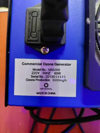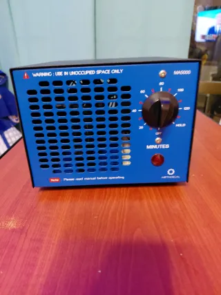 Generador de ozono MA5000. - Advertencia: Usar solo en espacios desocupados. - Temporizador ajustable en minutos. - Indicador luminoso. - Marca: AIRTHEREAL.