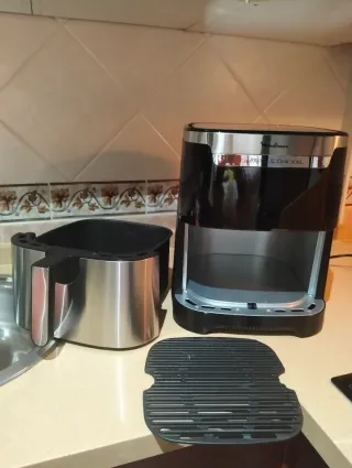 Freidora de aire Moulinex en acabado plateado y negro. Modelo Easy Fry & Grill XXL. - Diseño moderno y elegante. - Asa metálica para extracción. - Base de plástico negro. Usada en pocas ocasiones, totalmente nueva y limpia. Comprada en 2024 y con seguro contratado, en su embalaje original.