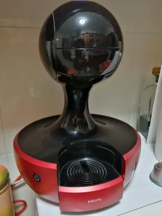 Cafetera Dolce Gusto Krups de color rojo y negro. Funciona perfectamente, se puede usar con cápsulas originales o con una de acero inoxidable y silicona en la que puedes echar café molido a tu gusto. - Diseño moderno y compacto. - Marca: Krups.