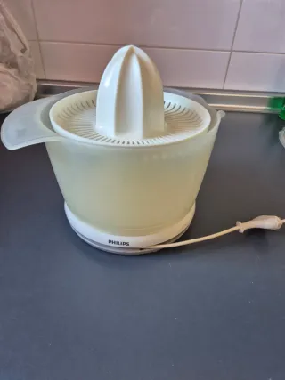 Exprimidor eléctrico de la marca Philips, ideal para preparar zumos frescos. - Diseño compacto y fácil de usar. - Jarra incorporada para recoger el zumo. - Cono giratorio para exprimir cítricos.