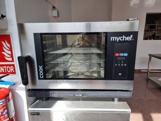 El objeto es un horno mixto profesional Mychef Cook Pro 6 GN 1/1. Capacidad para 6 bandejas gastronorm GN 1/1. Dimensiones: 760 mm (ancho) x 710 mm (fondo) x 750 mm (alto). Potencia de 9,3 kW. Cuenta con modos de cocción por convección, mixto (convección + vapor) y vapor saturado. Incluye sistema de autolimpieza MyCare y tecnologías patentadas como SmartWind y MultiSteam.