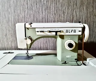 Máquina de coser Alfa modelo 482, con un diseño clásico en verde y blanco. - Marca: Alfa - Modelo: 482 - Combinación de colores: verde y blanco Funciona perfectamente