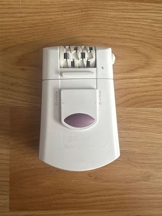 Depiladora eléctrica Braun Silk-épil en color blanco y morado, con accesorios. - Cabezal de depilación. - Cabezal de afeitado. - Cargador. - Neceser de viaje.
