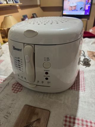 Freidora eléctrica de la marca Saxem, ideal para preparar tus comidas favoritas. - Diseño compacto y fácil de usar. - Indicadores luminosos de encendido y calentamiento. - Control de temperatura ajustable.