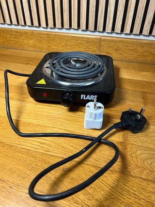 Hornillo eléctrico portátil de la marca Kmt Style, ideal para diversas preparaciones. Usado sólo para probarlo, al final no nos hizo falta. - Potencia de 1500W. - Voltaje 220-240V ~50/60Hz. - Material: Plástica Ferro+INOX. - Funciones: hervir agua, hacer café, cocinar verduras.