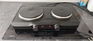 Hornillo eléctrico doble de la marca Ufesa, ideal para cocinar. - Dos placas circulares. - Control de temperatura individual por placa. - Indicador luminoso de encendido. - incluye tapa de madera hecha a medida