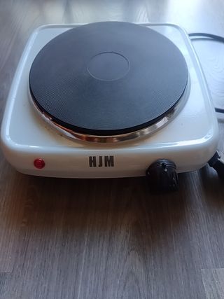 Placa de cocina eléctrica de 1 fuego HJM. Está nueva y es pequeña y blanca. - Funciona con electricidad. - Tiene un mando para controlar la temperatura. - La placa es redonda y de color negro.
