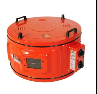Horno Torko de color rojo, ideal para cocinar. - Diseño circular. - Puertas frontales abatibles. - Rejilla interior. - Mandos laterales.