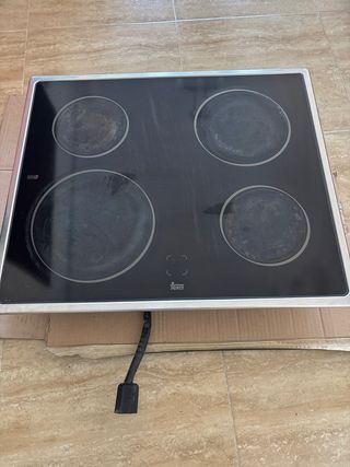 Vitrocerámica Teka de cuatro fuegos con superficie de cristal negro. Incluye horno de regalo, falla 1 resistencia del horno pero se puede usar si ella. - Encimera vitrocerámica. - Cuatro zonas de cocción. - Marca: Teka. - Horno incluido.