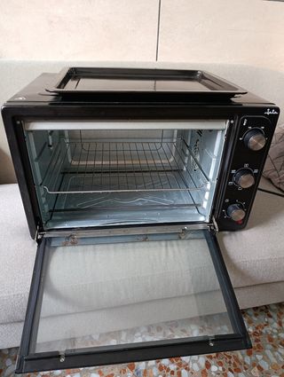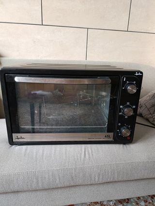 Horno eléctrico Jata de 45 litros de capacidad. Ideal para tu cocina. Apenas sin uso. - Color negro. - Puerta con cristal. - Incluye rejilla y bandeja, asesorios. - Múltiples funciones: convección, rotiserie, grill.