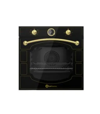 Horno eléctrico empotrable de la marca Solthermic con un elegante diseño en color negro y detalles dorados. - Diseño moderno con acabado en negro. - Tirador y mandos en acabado dorado. - Puerta con cristal. - Interior con rejillas.