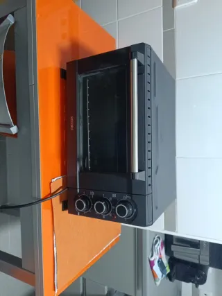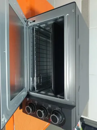 Vendo mi horno por tener uno nuevo Funciona perfectamente Son 150 nuevo !! A recoger en chueca Horno eléctrico compacto para colocar sobre la encimera de la cocina. - Puerta frontal con cristal. - Rejilla interior. - Bandeja. - Mandos de control. Su puerta abatible con doble cristal y termostato de temperatura hasta 230°C garantizan una cocción perfecta en cada preparación. Con una potencia total de 1400W, este horno en color negro se adapta a cualquier cocina. Sus dimensiones de 49.8 x 29.7 x 37.96 cm lo hacen ideal para espacios reducidos sin sacrificar capacidad. ¡Haz de la cocina un lugar más práctico y moderno con este i