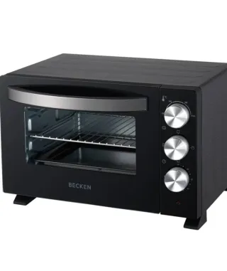 Horno eléctrico de sobremesa marca BECKEN con temporizador. Su diseño es moderno y compacto, ideal para cualquier cocina. - Color negro. - Acabado metálico en el asa y los mandos. - Bandeja y rejilla incluidas.