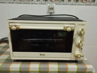 Horno eléctrico de sobremesa en color crema y diseño retro, con capacidad de 15 litros y potencia de 1000W, ideal para hacer cualquier receta. - Temperatura regulable hasta 230 °C. - Temporizador de hasta 60 minutos. - Incluye la rejilla. - Dimensiones: 25,5x27,5x32 cm. Precio nuevo en Amazon 60€ Actual precio Wallapop 18€