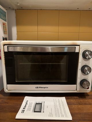 Horno eléctrico compacto, perfecto para colocar sobre la encimera de tu cocina. - Marca: Orbegozo - Modelo: HD 250 Potencia: 1500 W. › Capacidad: 25 L. - Color: Blanco - Incluye manual de instrucciones. Selector de temperatura de 100 ºC a 230 ºC. Temporizador de 60 minutos con señal acústica. Incluye accesorios: bandeja, parrilla y mango. Tiene unas marcas por el calor. Solo 7 meses de uso