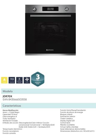 Horno eléctrico Johnson de acero inoxidable con gran capacidad. - Modelo: JOR70X - Capacidad: 70 litros - Acabado: Acero inoxidable - Panel de control digital Horno Multifunción Acero + Cristal Negro Capacidad 70 litros Clase energética A Turbo Ventilador Ventilación Forzada 8 Modos de cocción: Descongelación/Calor Inferior/ Cocción convencional/ Convencional + Ventilador/Grill/ Doble Grill/ Doble Grill + Ventilador/ECO Temporizador electrónico Función recordatorio Función consulta Función Inicio/Pausa/Cancelación Función de ahorro de energía Bloqueo infantil Iluminación interior Tirador metálico Display Digital LED Control táct