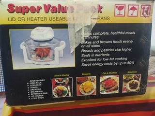 Horno tostador eléctrico con tapa de cristal y base negra. - Tapa de cristal. - Base negra. - Controles de temperatura y tiempo.