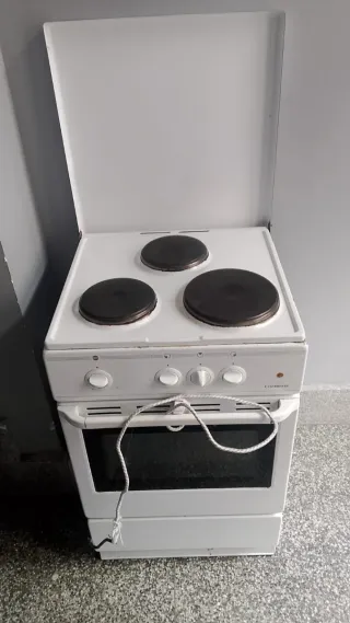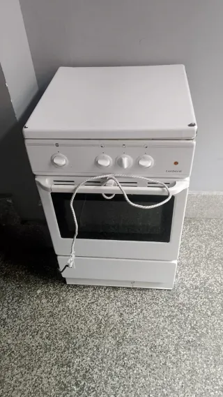 Cocina eléctrica blanca de la marca Corbero. Cuenta con tres fuegos redondos en la parte superior y horno. El Horno no funciona muy bien , Los tres fuegos funciona perfectamente, - Tres fuegos eléctricos. - Encimera blanca. - Puerta de horno con cristal.