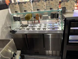 Vendo lote completo de maquinaria profesional para hostelería por 4.750€. El precio es negociable Todo el equipo es de alta calidad, fabricado en acero inoxidable y se encuentra en excelente estado, ideal para montar o renovar un restaurante, bar o pizzería. -Campaña extractora de 2 metros con 4 filtros seminuevos y muy buenas condiciones con motor de 1 cv -Horno para pizzas -Freidora -Plancha profesional -nevera de 3 puertas -bano maria - 2 frigorifico -nevera de 4 puertas -Mesa con lavabo -Mesa refrigerada de preparación con vitrina de ingredientes -Mesa de trabajo -Estanterías metálicas e Puedo vender las piezas individualmente