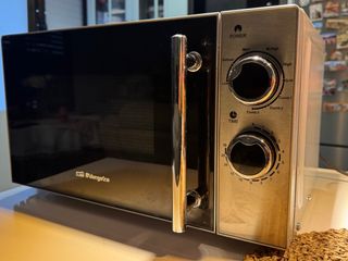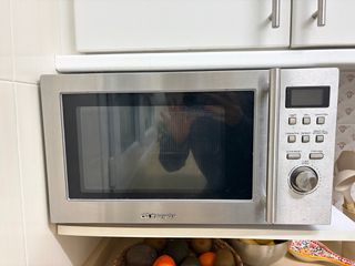 Horno microondas con función grill de la marca Orbegozo. Cuenta con varios niveles de potencia y funciones de descongelación y combinadas. - Diseño moderno en acero inoxidable y cristal negro. - Mandos giratorios para potencia y tiempo. - Puerta con tirador cromado. Potencia 1200W Usado solo 3 semanas