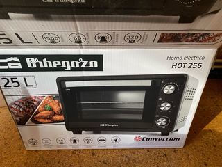 Horno eléctrico de la marca Orbegozo, modelo HOT 256. Tiene una capacidad de 25 litros. - Potencia: 1500 W - Temporizador: hasta 60 minutos - Temperatura máxima: 230 °C - Convección
