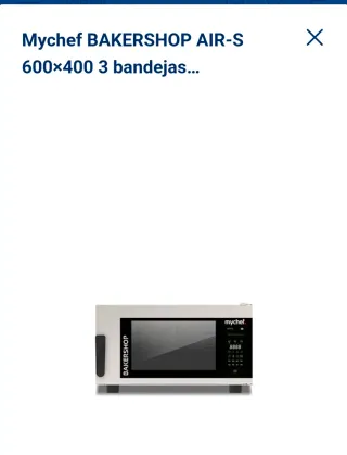 Horno profesional Mychef Bakershop AIR-S (600x400) Vendo horno Mychef Bakershop AIR-S, formato 600x400, con capacidad para 3 bandejas. Tiene 1 año y medio de uso, en estado prácticamente nuevo, muy bien cuidado y funcionando perfectamente. Es un horno profesional ideal para panadería, pastelería, cafeterías o cocina profesional. Ofrece cocción uniforme gracias a su sistema de aire, controles digitales intuitivos y construcción en acero inoxidable. Características principales: Marca: Mychef Modelo: Bakershop AIR-S Formato bandejas: 600x400 Capacidad: 3 bandejas Cocción por convección Uso profesional. Se vende por cierre de negocio.