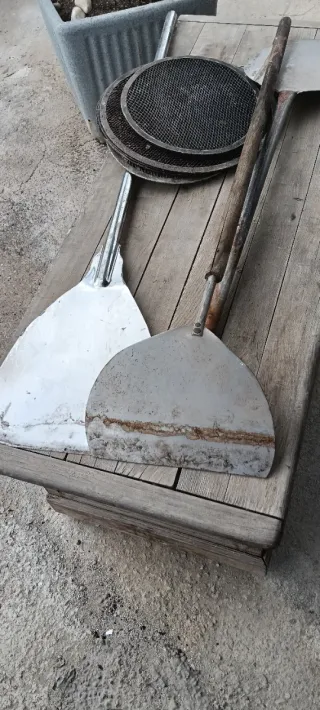 Set de palas para horno. Ideales para manipular alimentos en hornos de leña o pizzas. También hay bases para poner las Pizzas - Pala de metal con mango largo. - Pala redonda con rejilla. - Mango de madera.