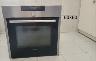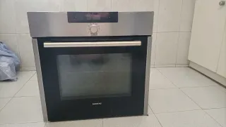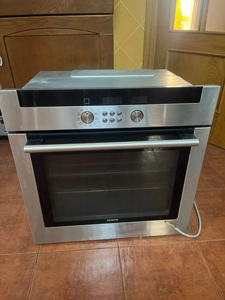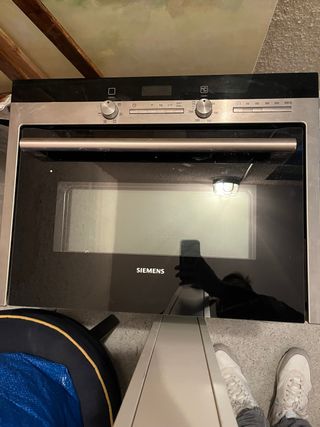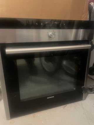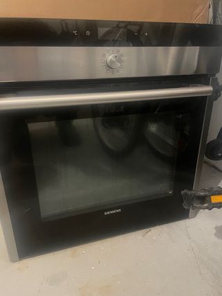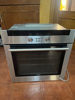 Horno de la marca Siemens. Usado pero en buen estado. - Diseño moderno en acero inoxidable y cristal negro. - Panel de control con mandos giratorios y pantalla digital. - Puerta con asa metálica. - Logo de la marca Siemens visible en la parte frontal. Solo a recoger en Aravaca o Las Tablas.
