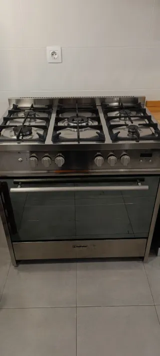 Cocina gas natural + kit butano Acero inoxidable 5 quemadores a gás de alta eficiencia Quemador Wok Encendido automático Válvulas de seguridad Parrillas en hierro fundido Dosel Horno a gás con encendido automático Volume útil 114L Válvula de seguridad Termóstato Grill a gás Iluminación Reloj digital Parrilla y tablero de recoger salsas Puerta removible con cristal doble Clase energética A Patas regulables - Medidas: 90 cm de ancho. - Tipo de gas: Gas ciudad. - Encendido electrónico. -Horno gas 5 años de uso en muy buenas condiciones muy bien cuidada. Con kit para gas butano