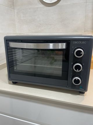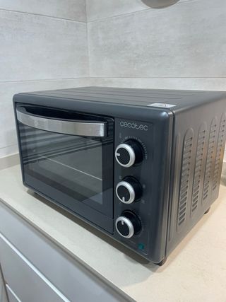 Horno eléctrico Cecotec de color negro. - Diseño compacto y moderno. - Puerta con cristal. - Mandos giratorios para control de temperatura y tiempo.