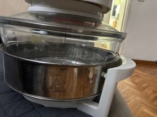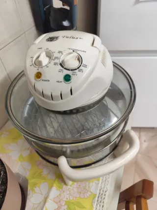 Horno de convección eléctrico con base de cristal y tapa superior. - Control de temperatura. - Control de tiempo. - Indicadores de encendido y calor. -Tarda de 3 a 5 veces menos que un horno normal. -Ahorra el 80% de electricidad. -Nuevo, nunca se ha usado, conserva su caja.
