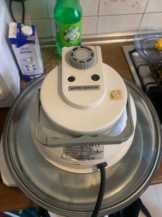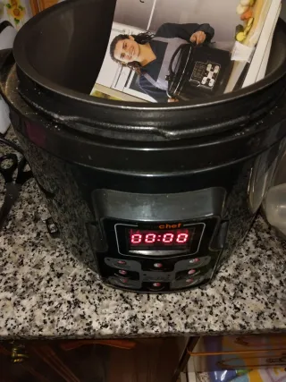 ¡Cocina fácil y sin estar pendiente! Vendo robot de cocina programable de la marca Gourmet (modelo Practical Technology). Ideal si tienes poco tiempo: metes los ingredientes, programas la hora y tienes la comida caliente al llegar a casa. Características: 🥣 Multifunción: Tiene menús para Plancha, Horno, Freír, Guisos, Cocina al Vapor y Fuego Lento. 🕒 Programable: Puedes reservar la hora de comer (botón RSV). 🔥 Mantiene el calor: Función automática de "Calentar/Recalentar". 📱 Pantalla digital: Fácil de usar. - Asa superior para transporte. - Panel de control con pantalla digital y botones.