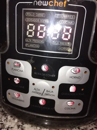 Olla programable New Chef con múltiples funciones. Es de 6litros y 1000w de consumo a la hora. - Programas para Pollo/Carne, Legumbres, Guisados/Sopas, Cocina, Plancha y Horno. - Opciones de Alta y Baja Presión. - Función Hora de Comer y Caliente/Cancelar.