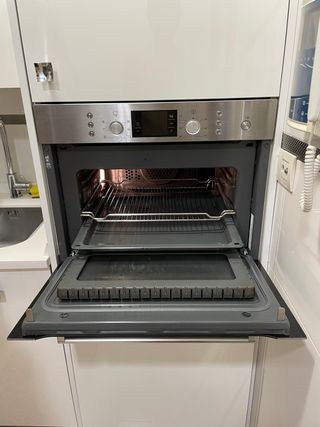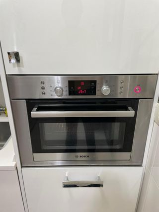Horno compacto de la marca Bosch, ideal para cocinas modernas. Horno compacto con microondas, la función de microondas ha dejado de funcionar, y hemos preferido comprar un horno microondas nuevo. El horno está como nuevo pero tiene más de 10 años. precio negociable - Diseño elegante en acero inoxidable. - Panel de control digital con pantalla. - Puerta con cristal para visualización.