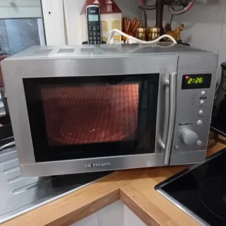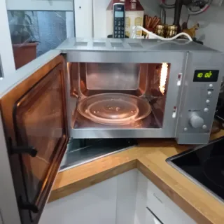 Microondas plateado con puerta abatible. - Interior espacioso. - Plato giratorio de cristal. Con enganches para cooocar en un mueble de cocina o Ponerlo en la encimera se prueba delante del comprador si lo desea 40 euros algo negociable acero inoxidable