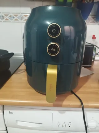 Es una freidora de aire Bear de 3,5 litros, un electrodoméstico que cocina los alimentos mediante la circulación de aire caliente, similar a un horno de convección en miniatura. Utiliza tecnología de circulación rápida de aire caliente de 360°, lo que permite cocinar con un 85% menos de aceite o grasa que las freidoras tradicionales. Cuenta con dos diales para regular la temperatura (80-200°C) y el tiempo (hasta 30 minutos), con apagado automático. La cesta es extraíble, antiadherente y apta para lavavajillas, con una rejilla también extraíble en el fondo que ayuda a separar la comida del exceso de grasa. Su capacidad es de 3,6