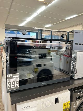 Horno eléctrico Haier con gran capacidad y múltiples funciones. - 11 funciones - 90 litros de capacidad - Bajo consumo energético (Clase A) - Medidas: 74 x 59 x 59 cm