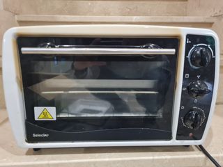 Horno eléctrico en perfecto estado. Funciona perfectamente y cocina los alimentos muy bien. Con grill. Lleva una bandeja metálica de rejilla. incorporada. Medidas: ancho 30cms fondo 30 cms alto 20 cms Le falta un tirador plástico al asa de la puerta, pero abre perfectamente, porque tiene el tirador metálico. No hago envíos. Entrego en mano en Majadahonda.