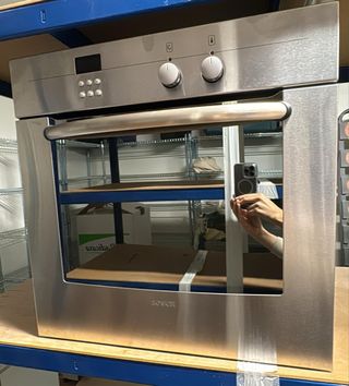Horno de acero inoxidable de la marca Bosch. - Diseño moderno y elegante. - Panel de control con pantalla digital y botones. - Tirador metálico. - Dos mandos giratorios.