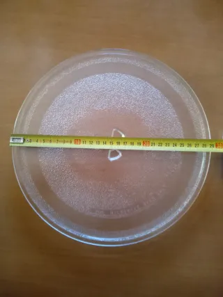 Plato de vidrio para microondas. Diseñado para adaptarse a la mayoría de los hornos microondas. - Material: Vidrio templado. - Diámetro aproximado: 24.5 cm. - Con tres muescas para el soporte giratorio.