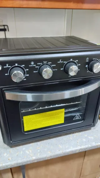 Horno eléctrico de sobremesa con múltiples funciones. Ideal para preparar una gran variedad de platos. - Control de temperatura y tiempo hasta 230 grados - Funciones: Air Fry, Broil, Bake, Toast, Warm. - Diseño compacto y moderno.